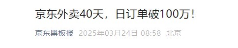 3月24日,京东宣布,在上线40天后,京东外卖日订单已突破100万。